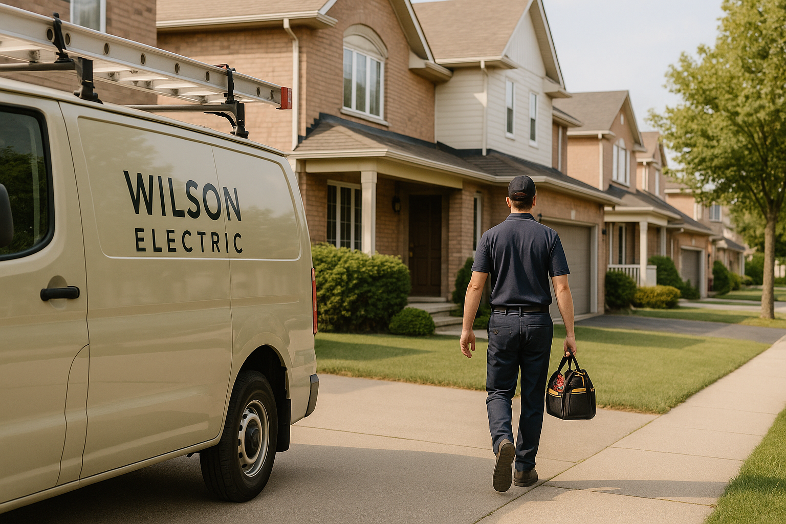 Wilson Electric Inc electrician carrying tool bag walking toward a modern suburban home in Whitby with a branded service van parked nearby